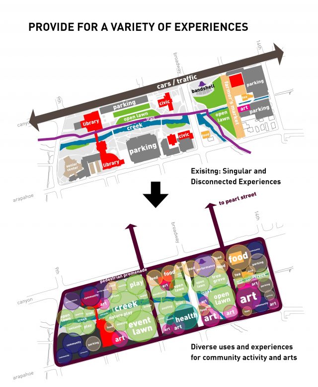The green space along Boulder Creek will provide significant open space and will be the unifying design that weaves existing and new facilities with a rich diversity of civic, commercial, recreational, artistic, cultural, and educational amenities and programs. The plan maintains beloved places – theDushanbe Teahouse, the Boulder Public Library, the Farmers’ Market and City Offices, yet identifies future facility needs and makes more space for art, food and cultural uses that provide more 24/7 activation. All together, these elements create a true civic heart for the Boulder community, a place where the city’s past, present, and future are debated, celebrated, and realized.