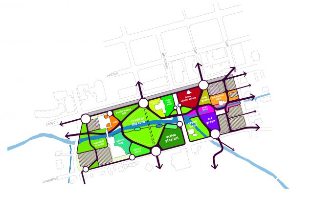 The Master Plan articulates a unified park-core along Boulder Creek, expanding experiences along the Boulder Creek Path and flanking the urban grid with bookends of activating civic, cultural, and commercial buildings. The plan provides for a variety of experiences and strategic connections to key portions of the city – revealing the site’s lost natural history while creating a lively and distinct destination that reflects the community’s values. Values where people of all ages, abilities, backgrounds, and incomes feel welcome to recreate, socialize, deliberate, learn, and access city services.