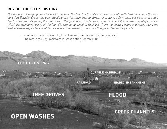 The Master Plan is located within the 100-year floodplain, and much of the land lies within the High Hazard Zone (HHZ) and Conveyance Zone. The plan works to phase out buildings and surface parking that are at risk in the HHZ and is proactive about restoring open space allowing for “room for creek” flooding. The restored flood plain “washes” are modeled to provide resilient pedestrian connections, structures and native planting eco-tones, while enhancing the experience and safety of the community. The park will provide a new urban experience of the creek with re-interpreted landscape akin to what Frederick Law Olmsted Jr. described in his 1910 report for Boulder as the “washes” of Boulder creek.