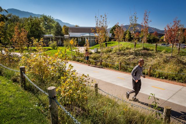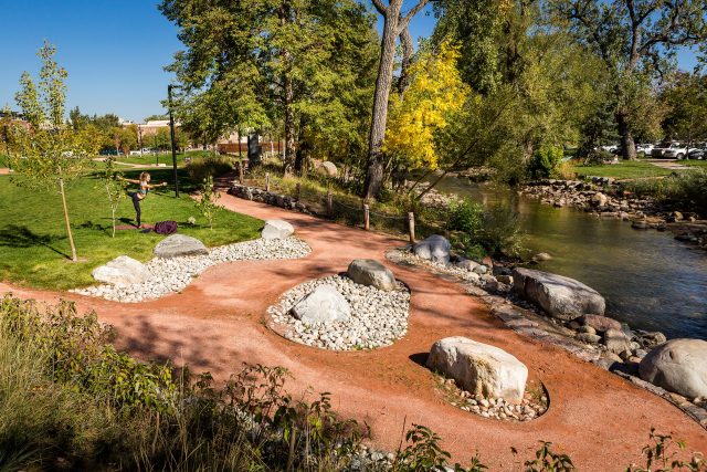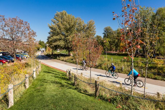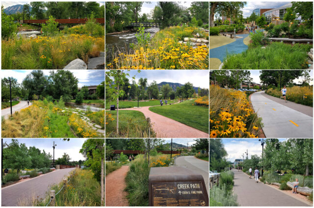 The park is thoughtfully designed to offer a diverse mix of spaces that vary in size and character, creating a human-scaled environment that feels welcoming, safe, and flexible for a range of users and activities. From intimate nooks to open lawns, the layout encourages daily use while accommodating civic events, play, and moments of quiet reflection. A key component of the design is the restoration of Boulder Creek’s flood-prone “washes”, with the reintroduction of native planting and dynamic topography to improve habitat diversity and enhance public safety within the 100-year floodplain. These landscape interventions not only increase resilience but also provide interactive experiences with nature, allowing children to safely explore the creek’s edge and enjoy views of the Flatirons along shaded walking paths.