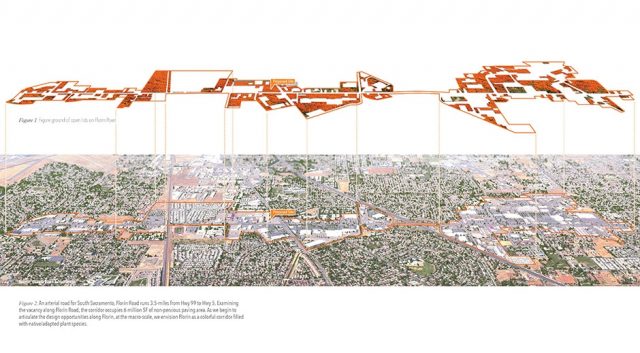 For South Sacramento, Florin Road is a significant commercial thoroughfare for the local community. Over the last century, Florin Road has experienced significant changes to its landscape. From once thriving agriculture fields, to a booming commercial corridor in the middle of the 20th century, Florin Road’s landscape is a composite of fragmented commercial strips, razed retail centers, and vacant large-scale auto dealerships, resulting in 6 million SF of paving area. The large parking areas that dominate the landscape, contribute to heat island effect, disconnected urban tree canopy and reduced open space. Moreover, climate change challenges and regional issues of drought in the California valley have called for an unprecedented need for innovative design solutions to tackle the suburban landscape (i.e. shuttered retail properties, extraneous paving and lack of planting).
