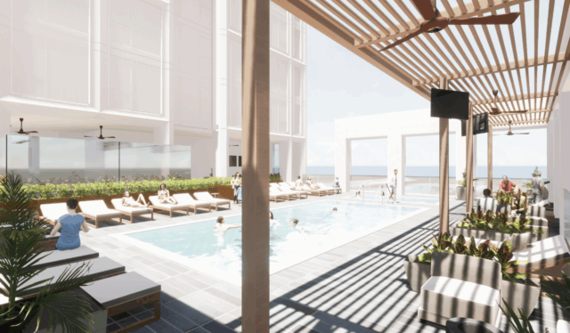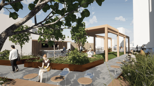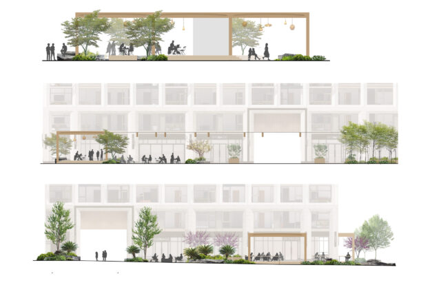 The Central Plaza serves as the primary gathering space and welcome mat for Lot X. Visitors from Capital Mall on the north, and visitors arriving from Crocker Park are greeted by an activated public frontage. Wood pergola structures and wood decking provide inviting and shaded seating areas that recall the front porches typical to Sacramento’s historic neighborhoods and tie the landscape to the building architecture. Overhead lighting, both within the pergola and suspended over the lawn, draws on the welcoming visual language of front porch pendant lights. Varied and dynamic plantings provide a landscape-based frontage experience, while providing visual screening from the parking garage on the east side of 3rd Street. The Front Porch and adjacent plantings frame a central gathering lawn.
