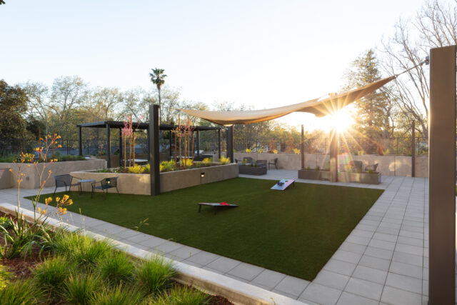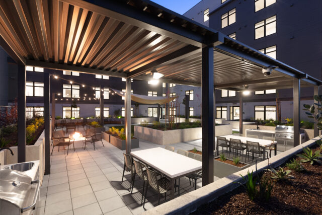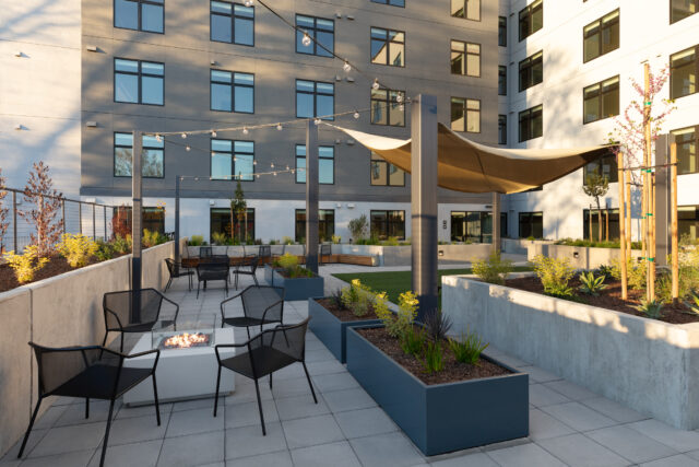 Atlas Lab designed an expansive podium-level roof terrace featuring a variety of social and recreational spaces for residents. The terrace includes a central gathering area for passive recreation, a custom outdoor kitchen and dining space, integrated fire pit seating with custom-built benches, and drought-tolerant plantings that provide texture, color, and year-round interest.