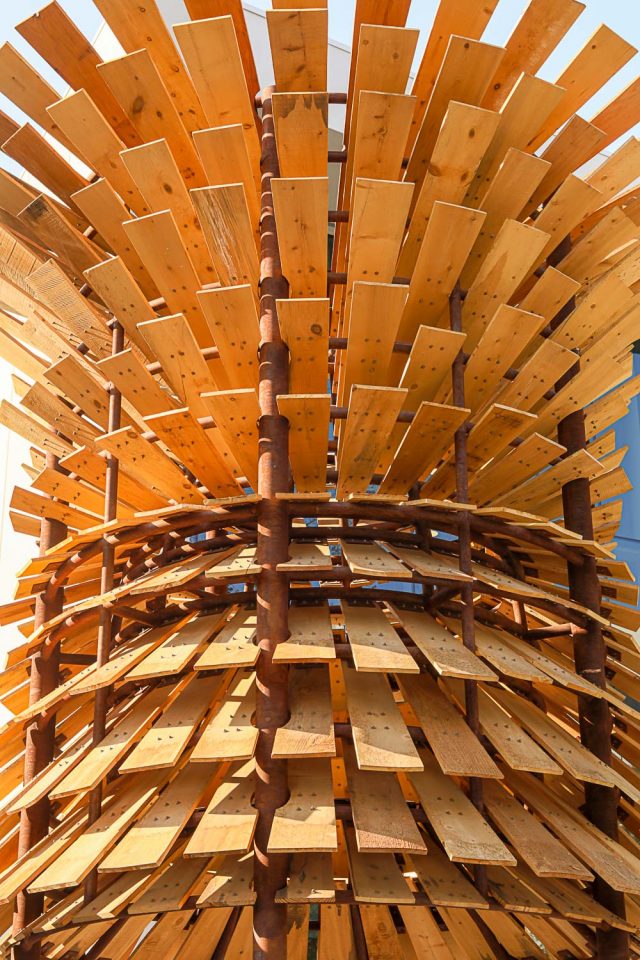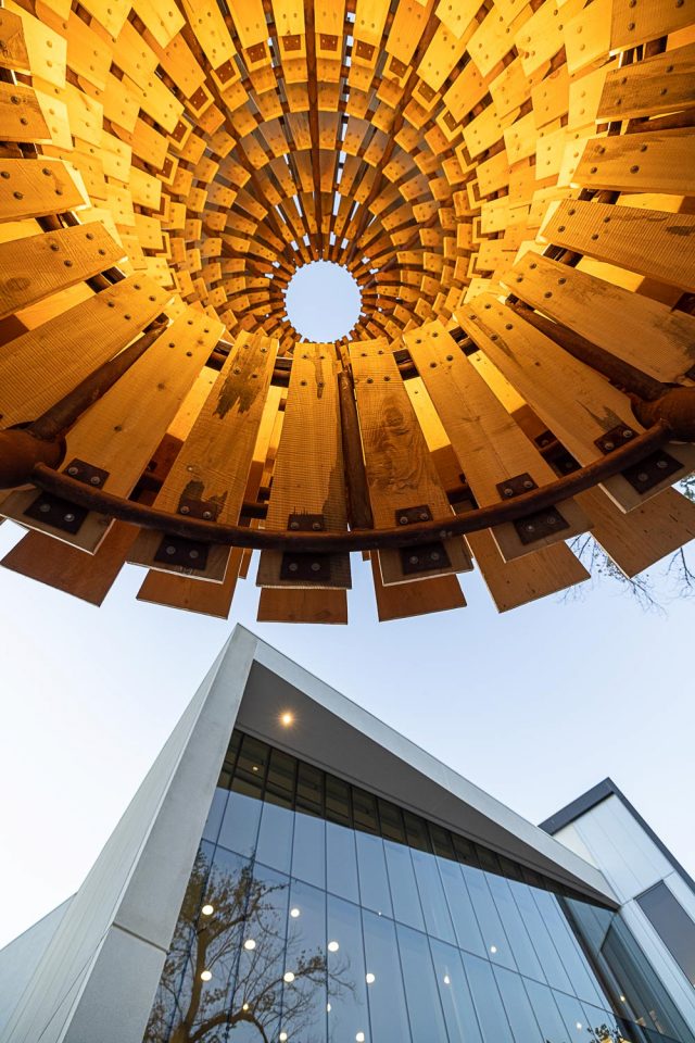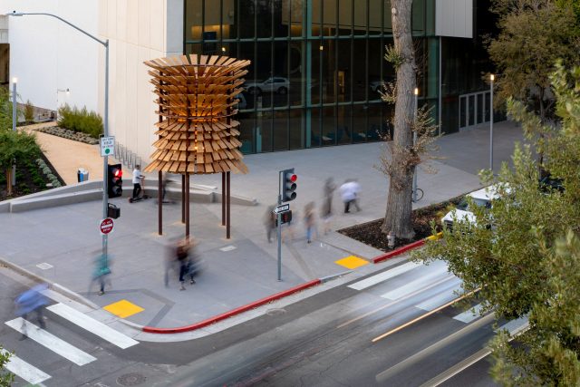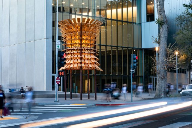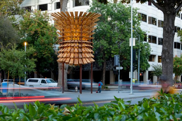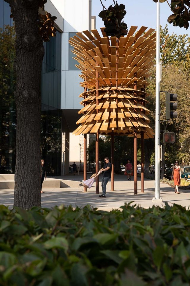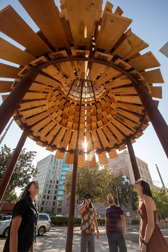 Atlas Lab was awarded the public art call for the Sacramento Convention Center. Entitled “California’s Cathedral” the sculpture responds to climate change in California. Towering redwoods, pines, cedars and firs comprise most of California’s hillsides and mountain landscape. This landscape has served as a haven for contemplation, adventure and wonder. Over the last decade, shifting climate patterns, have compromised this landscape, causing a loss of 147 million trees in the state of California. In response, “California’s Cathedrals” highlights this threatened landscape by collecting and reinterpreting the trees lost, into a vertical mosaic. The sculpture itself is a series of wood planks (from salvaged trees lost due to climate change) supported by cylinder frame, that echoes a tree form. Community members are invited to interact with the sculpture through an outward and internal experience. Internally, wood planks frame a view of the sky, as the soaring trees do in the landscape—evoking a contemplative and whimsical experience.