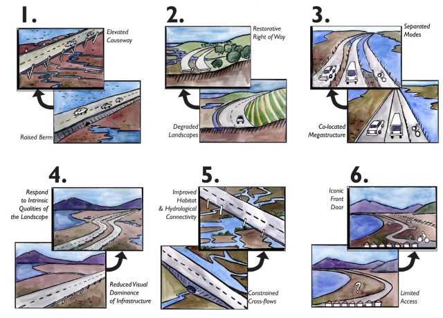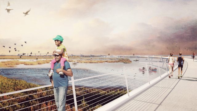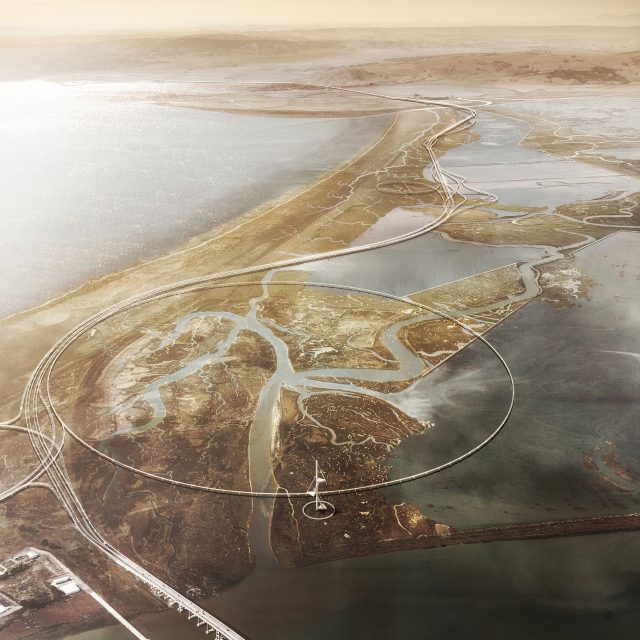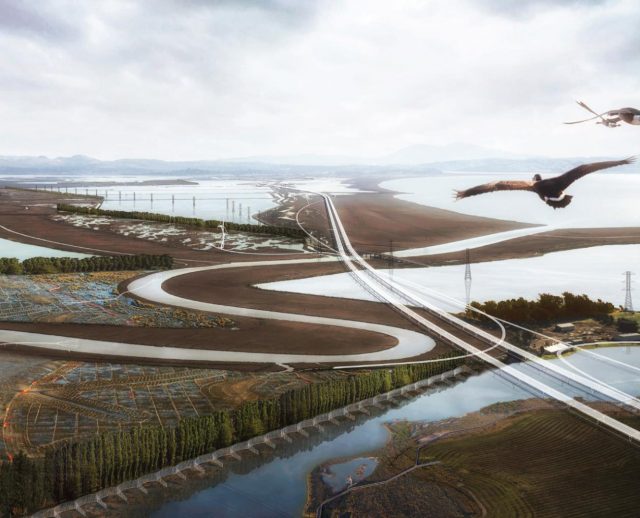 The project proposes to resolve the transportation problem of Highway 37 by designing a scenic causeway and parkway elevated on columns 20 feet high, allowing tidal flows and marsh migration to return to their natural condition. The causeway is designed with the same ambition and flair as other iconic bay crossings but based on 21st-century sensibilities for the natural environment and diverse transit types, not just vehicles. This design is based on the ecological and landscape principles of scenic byways and parkways, curving to open views over the bay and marshes and oriented to natural landmarks while allowing for passage of hydrology and key habitat underneath. Lane directions, as well as the Bay Trail, are “unspooled” and flow independently like the sloughs they traverse, creating access to open space below. This level of investment in design and visibility for an ecological “Central Park” will return major value for the region, its identity, and its future.