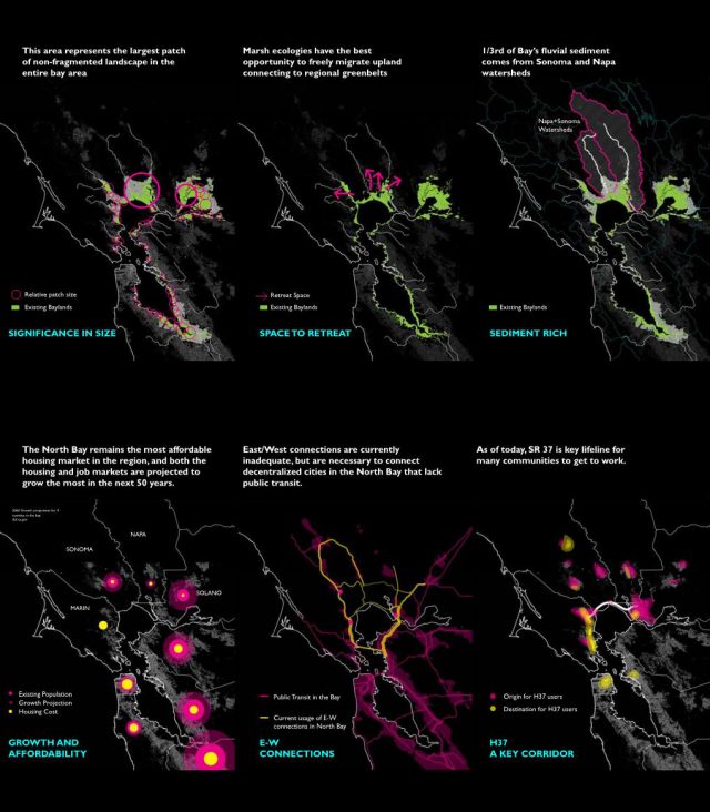 The team worked to understand the surrounding stakeholders and their concerns with the highway planning, as well as the extent of the ecological impact. The “Grand Bayway” came to stand for the regional significance of the entire zone including “flows of people, flows of water”, not just the highway project alone. The expanded holistic scale of planning was recognized as relevant to the MTC and BARC missions within the region, which presented the exciting opportunity to continue and build upon our initial work.
