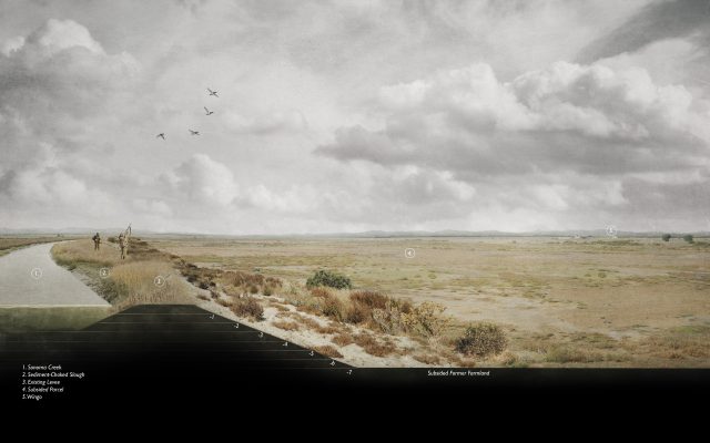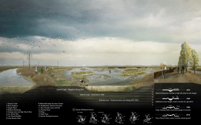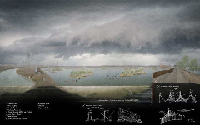 A great mobility loop will encompass the open space involving pedestrian and bike routes collocated with an excursion train using an existing freight line. Integral to the concept of a loop is to provide multi-modal, redundant means to travel through the area should SR37 be closed due to flooding or a seismic event. The huge Baylands complex is of course inextricably linked to the resolution of the highway. To prepare for rising sea levels, the project proposes to create an ecological laboratory working strategically with streams and diked sloughs to incrementally re-engage sediment deposits and cultivate biodiversity through various means including “sediment trains,” hyper-accretion gardens, and floating wetlands.