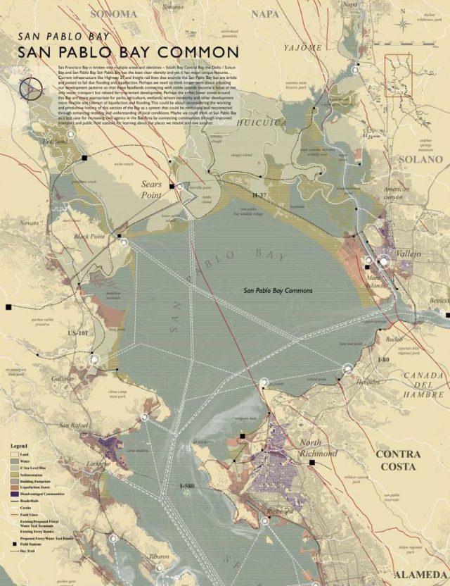 The Common Ground team was first charged with understanding the complexity and urgency of addressing the issues with highway 37. The intricacies of negotiating among many management plans, grasping complex governance structures, the impending threat of sea level rise, and the upfront costs all pose significant challenges and present hard questions for planning a multi-benefit, long term infrastructure project. As can often be the case with complex challenges, the Common Ground team took the opportunity to ‘make the problem bigger’ to solve it; we expanded the scope to include the entire San Pablo Baylands to the north as a way to contextualize the highway and the surrounding areas at a holistic, ecologically and socially relevant scale.