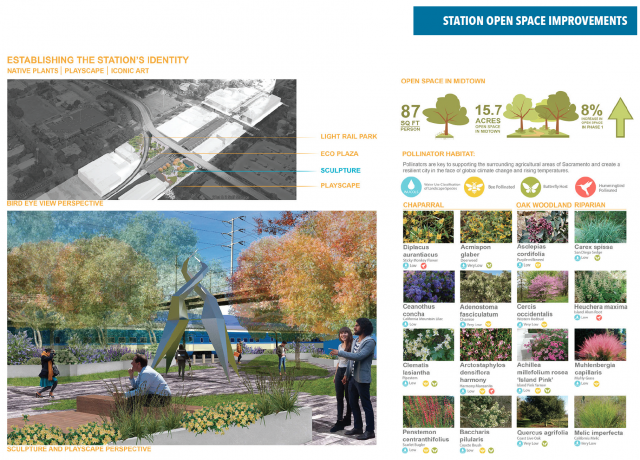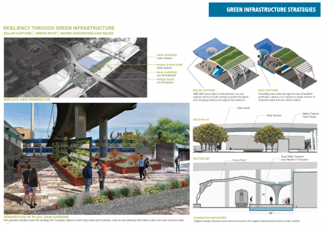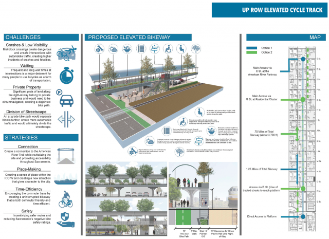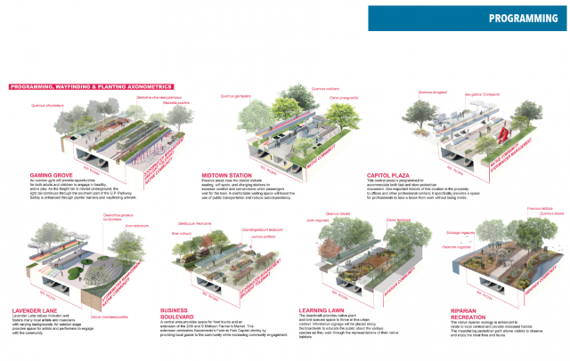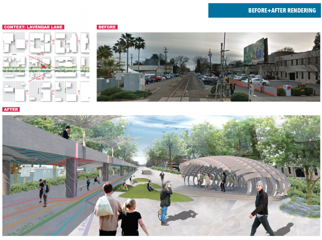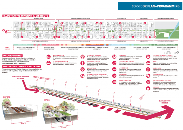Through lectures, studio problems, research projects, and discussion, students focused on developing urban form along a proposed passenger rail line in downtown Sacramento—driven by social, political ecological, and environmental dynamics. A landscape architecture design studio led by UC Davis Lecturer and Design Professional Kimberly Garza, students were asked to produce innovative urban frameworks that support richer urban experiences in the built environment. Throughout the intensive 10-weeks design studio, students assessed constraints and opportunities, analyze TOD and neighborhood revitalization benefits, and developed concepts for the Midtown Station and its associated bike and pedestrian connectivity. The studio built on current efforts by ACE and confronted the challenges posed by: (1) an auto dominated landscape that makes it difficult for alternative forms of transportation to co-exist, (2) vacant and underutilized sites that weave along the corridor, and (3) a lack of public gathering spaces and other amenities to serve adjacent neighborhoods.