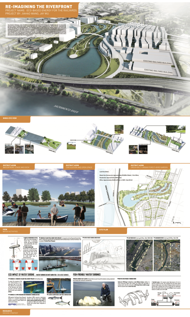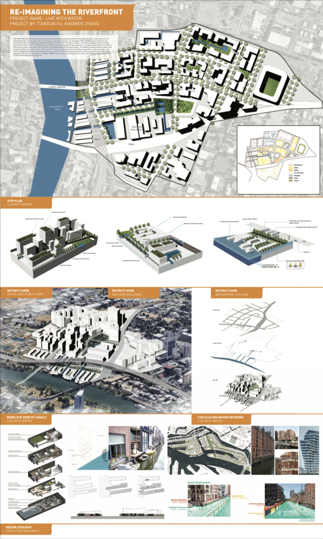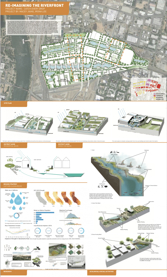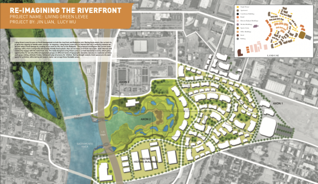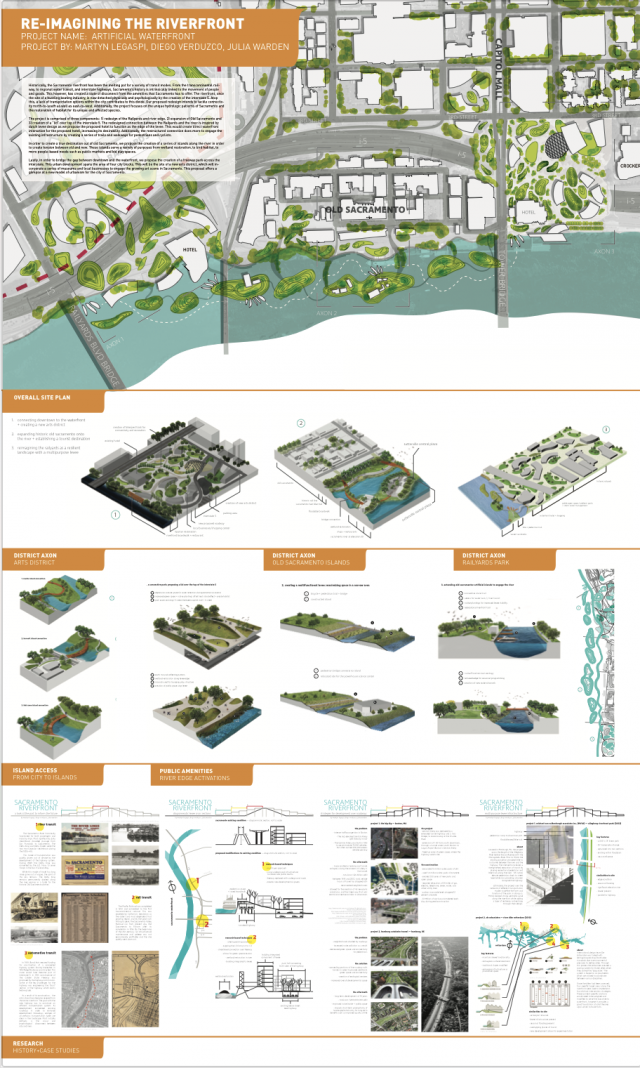 The Sacramento and American Rivers are Sacramento’s biggest asset, yet there is little to no connection between the City and the River. Historically, Sacramento’s riverfront (pre 1850s) was once a freshwater wetland, experiencing tidal influxes. The Gold Rush (1850s) transformed the Sacramento riverfront into a bustling port and boat corridor that served the greater region. The introduction of levees, automobiles and highways, at the end of 19th and 20th century, transformed the once active riverfront into a neglected, narrow strip of land that lacks robust ecology, pedestrian safety and accessible public amenities. In response to these conditions, UC Davis landscape architecture students critically examined Sacramento’s urban framework to re-conceive traditional urban planning models (often reliant on principles of stability and permanence) as a means to increase engagement with the river while addressing ecological resilience. Sacramento is experiencing an urban renaissance and is in a unique position to engage and celebrate the river as a public amenity and economic driver for the region. The following student projects represent a range of design solutions for the Sacramento riverfront and Railyards area that pertain to: flood, drought, water quality, riparian habitat and tourism, in an effort to produce innovative and authentic urban frameworks that support richer urban experiences for the City of Sacramento.